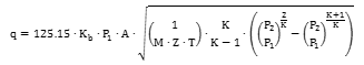 q 額定泄放量 Kb 泄放系數 P1 大泄放壓力 A 流道面積 M 摩爾質量 Z 壓縮系數 T 泄放溫度 K 絕熱指數 P2 背壓 d 流道直徑