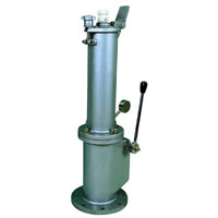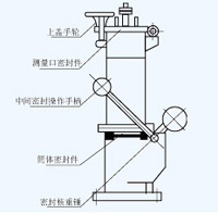 產品安裝在儲罐頂上,平時均能絕對密封,需要測量化工品時,先旋開、拔出測量口密封件,將窄口式測量組件放在上蓋中間擰緊,再按下中間密封操作手柄,就能打開筒體密封件,此時將測量尺從上方窄口縫中伸入,即可測量液位的標高。操作完成后先拉回手柄,取出測量組件,再放入密封件擰緊。如對油品進行測量、取樣時,拉下中間操作手柄,打開上蓋即可。